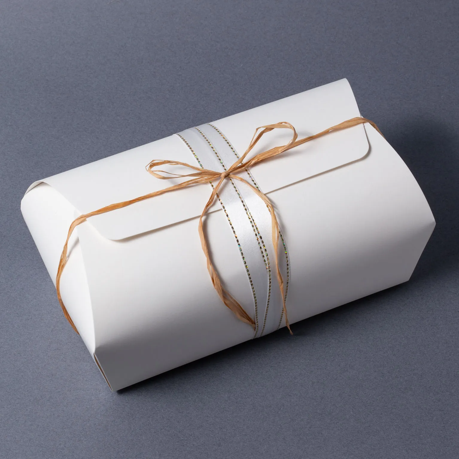 白を基調にした和菓子・洋菓子どちらにも使用し易いギフトボックスです。カーブのデザインが上品さを表現しています。焼き菓子が5~7個入ります。 ※積み重した状態で納品となります。リボンは別売りです。