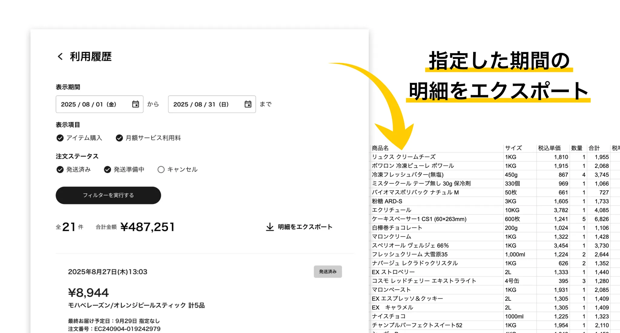 この度、「マイページ」の利用履歴より、仕入れたアイテムの履歴を一括表示およびCSVファイルでダウンロードできるようになりました。表示期間は自由に指定できます。